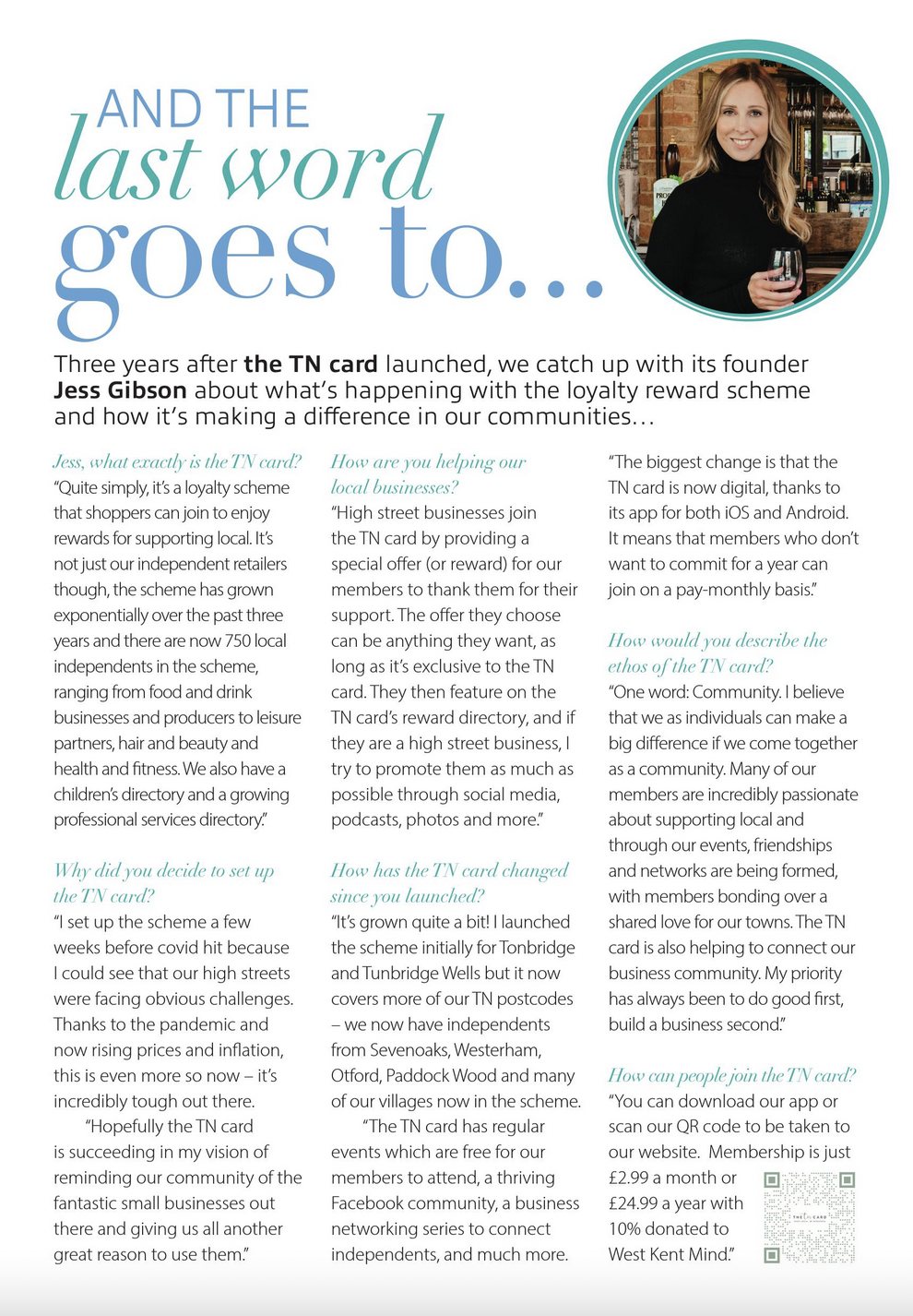 Thank you to Local Lifestyle TW for giving us the Last Word in their May magazine, out now! We last spoke to David and the team just after launching in 2020, so it's been wonderful to give an update on how the TN card is going.